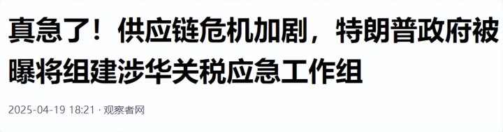观察者网 2025-04-19 18:21真急了!供应链危机加剧,特朗普政府被曝将组建涉华关税应急工作组